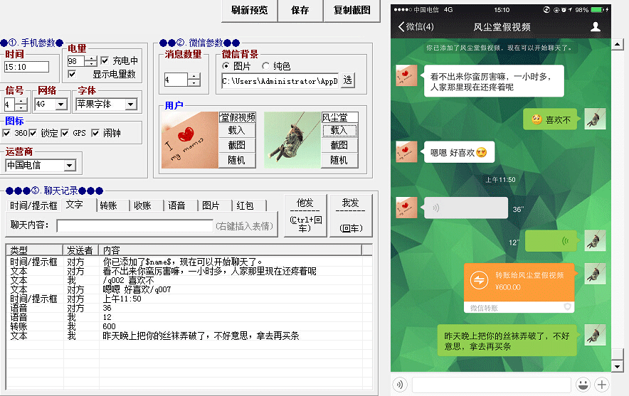 具体大家怎么用,自己去生成聊天相应的内容。可在对话框中插入系统提示、转账、红包、语音、图片等超多丰富功能!