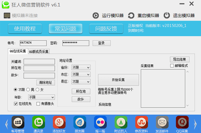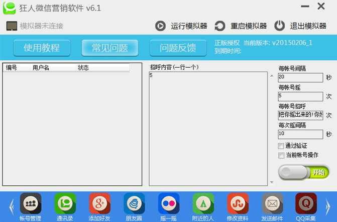 自动添加好友:营销最重要是好友要多,不管做徽商,还是做微信引流,都需要大量好友,可以大量导入QQ号添加至好友或自动和附近的人打招呼