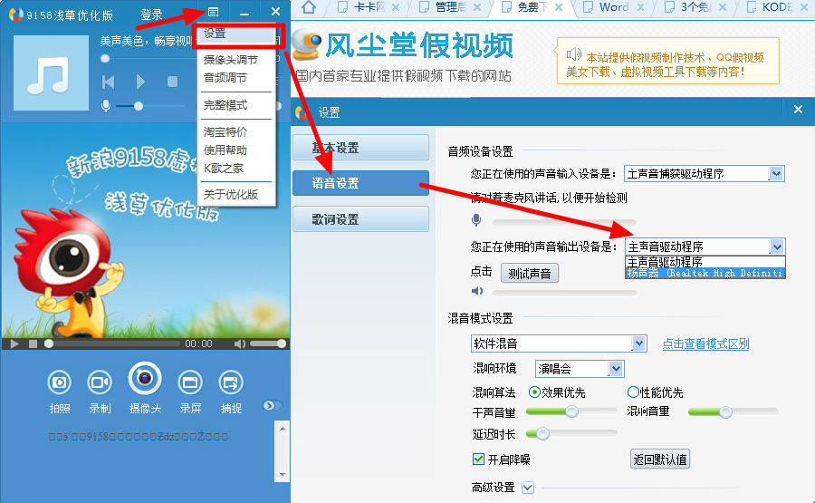 打开9158虚拟视频,或者9158浅草优化版。依次点击设置、语音设置,然后在输出设备里选择合适的输出音频设备即可(如下图)