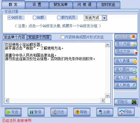 其实各个QQ群发软件都差不多,软件只是模拟人工帮你全自动完成发送消息的动作。并不是无限制群发(即使你手动群发,发送过频繁,腾讯也会限制你)。
