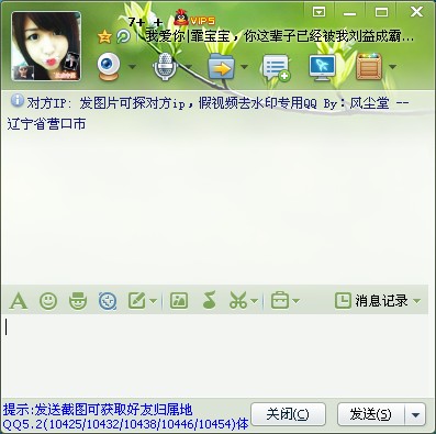 本版本除了不会显示QQ假视频水印的特点,还有显示对方ip功能,另外还可知对方的QQ版本号。